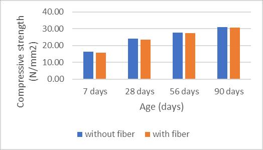 Thecompressionstrengthofeachsampletestedafter7,28, 56 and 90 days of curing period. The average of three samplesistakenasthecompressivestrength.Theresultsof average compressive strength and also the percentage change in compressive strength with fiber reinforced concreteandnormalconcrete.