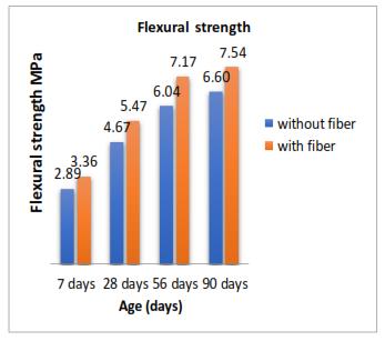 The result given in table 4 is point out that the flexural strength is improved with sisal fiber. The percentage incrementsinflexuralwithsisalfiberare16.20%,17.09%, 18.61% and 14.47% at the age 7, 28, 56 and 90 days respectively.Itcanalsobeconcludedthatwithincreasingage the%changeflexuralstrengthisalsoincreasing