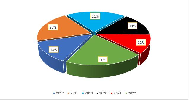 As mentioned in the abstract that this research will focus more on the area of AI and robotics in cybersecurity and healthcareforthepast6yearswhichisfrom2017to2022.In light of the foregoing, we gathered all the references and brought out the percentage of the papers used in this research for each and every respective year. The pictorial representationofthesameisshowninfig.3whereallthe percentagesareclearlystated.