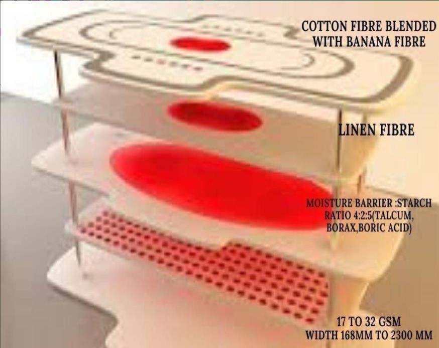 Bananafibreisoneofthemostenvironmentallyfriendlyrawmaterialsforsanitarypadsduetothemonocarpicreplantability ofbanana plantsandtheuseofagricultural wasteastheir pseudo-stem. Theyarebothenergy- efficientandsimpletomassproduce. The superior absorption qualities of banana fibre allowed us to create sanitary pads that are hygienic, simple to wash, and quick to dry. The prolonged life of these sanitary napkins can greatly reduce the environmental risk provided by discardedsanitarypads.