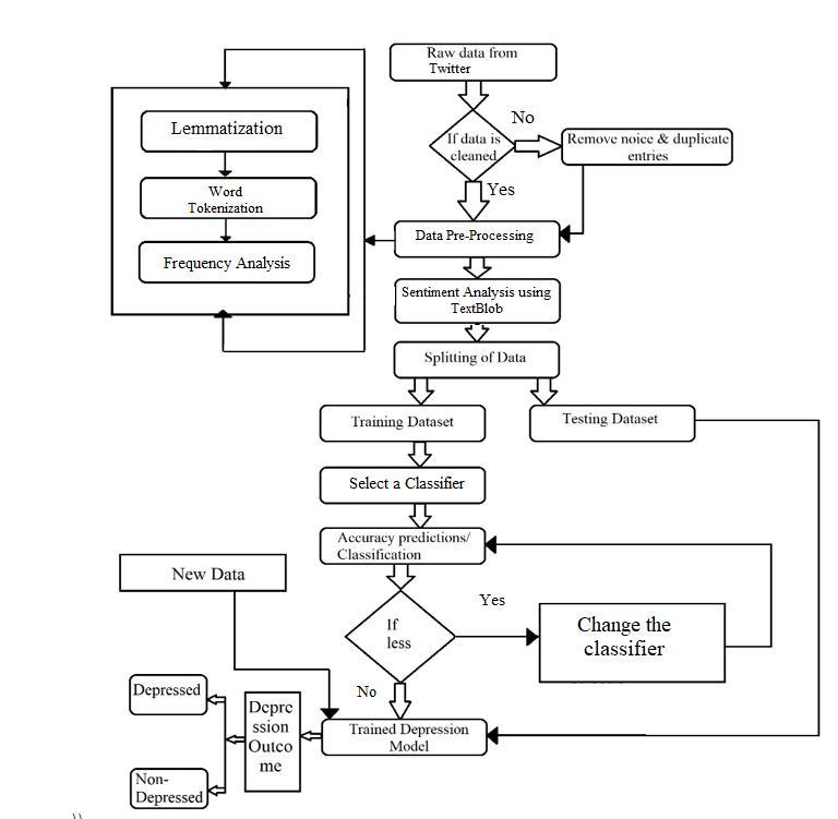 The cleaned dataset is now used to train and test the machinelearningmodel.Scikit-learnmakesiteasytocreate andtrainmodels.Thedatasetissplitintotwoparts,training andtesting,andissplit80/20.Thedatasetistrainedwith various classifiers such as Random Forest, Decision Tree, NaiveBayes,Regression,etc.andaccuracyiscalculated.We found that the Extra Tree had the highest accuracy in predictingwhetherornotaTwitteruserwasdepressed.
