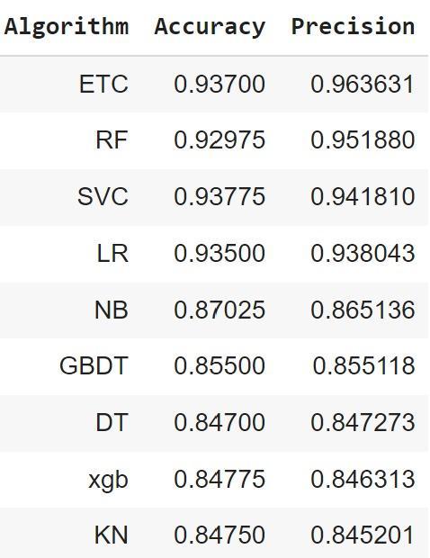 DifferentclassifierssuchasSupportVectorClassifier(SVC), K-Nearest Neighbors (KNN), Decision Trees (DT), ComplementaryTreeClassifier(ETF),RandomForest(RF), Logistic Regression (LR), Nave Bayes, Gradient Boosted Decision Trees (GBDT) ) ) and xgboost were trained and analyzed.