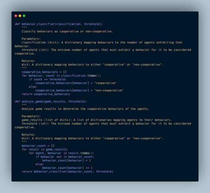 Next,wewroteafunctionclassifyuserstoclassifytheagents accordingtotheirbehaviourpatterns.Thisfunctioncounts the number of agents with each behaviour and returns a dictionary mapping behaviours to their frequency. This allowsustoidentifythebehavioursthatareexhibitedbythe most agents, and to understand the overall distribution of behaviourswithintheswarm.