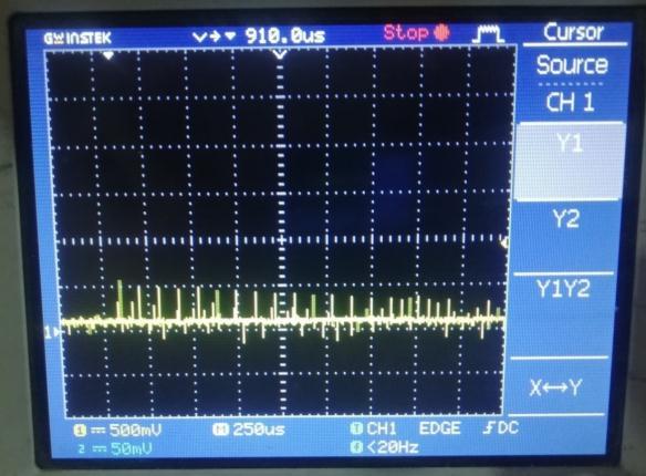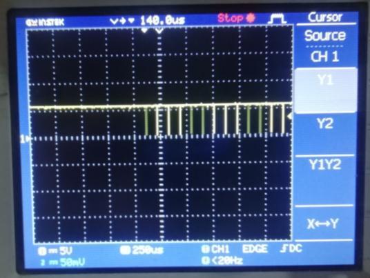 Thecaptured pulsesareshown infigure 11are the pulses at RX pin of receiver microcontroller. These are narrowed becauseofdistortionandfastdischargingcharacteristicof capacitor these pulses are capable to drive the TX pin of controllertodecodethemessagesentbytransmitter.