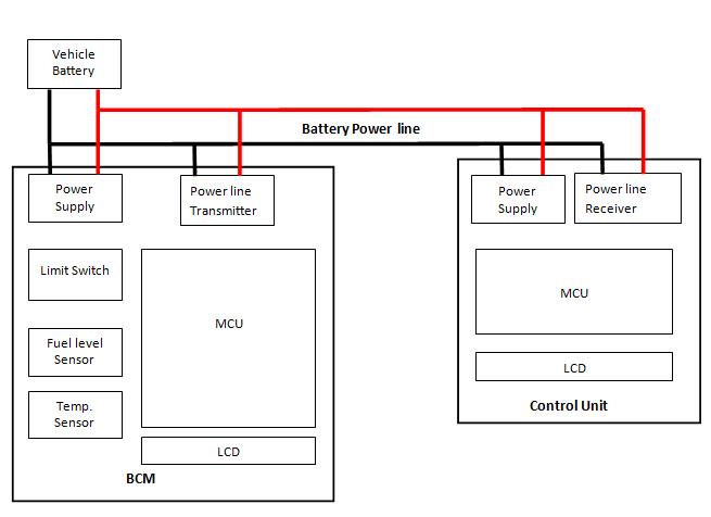 1. Power line transmitter: Power line transmitter (Vehicle BCM) comprises with power supply section, sensors like level sensor, switch type sensors, LCD display, and 8 bit microcontrollerunit