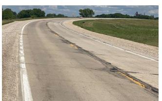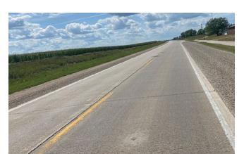 As a result of the opening of a liquid fertiliser factory near the western edge of Hampton, the Iowa Department of Transportation (Iowa DOT) built a 3 in. thick, 1.8 mi. long COC-B overlay on Iowa 3, a state major route, in September 1994.IowaDOT-sponsoredresearchwiththegoalsofmeasuringtherateofbondstrengthdevelopmentbetweenconcrete overlays and existing pavements and evaluating non-destructive testing techniques for estimating concrete strength includesdocumentationofthisproject(Cable1995).Theoriginal10in.thickconcretepavementwith10ftwidegranular shouldershadbeenbuiltin1969.Beforeapplyingtheoverlay,therewassomemildspallingatthecentrelinejoint(Figure 15). In1994,theoverlaywasbuiltonelaneatatimewhilebeingdrivenonbypilotvehicles.Utilizing36-inch-long,epoxycoated, deformed No. 5 reinforcing bars to delay reflection cracking of mid-slab nonworking transverse fractures was a novel element of the overlay. Prior to the installation of the overlay, the bars were fastened to 42 crack areas in the existingpavementsurface,asillustratedinFigure16.Eventhoughreflectivecrackingdidhappen,thesefissureswerejust hair-thin. Figure 17 shows that as of 2021, the COC-B overlay is in good shape after 27 years of operation, with the exceptionofa0.25miportionFigure18.Themildspallingthatwasfirstseeninthecentrelinejointoftheoldpavement in 1994hasnowbeenmirroredintotheoverlayandhasbecomemoresevereatthewestendoftheoverlay.
