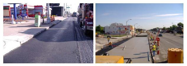 InAugust2004theprojectwasputouttobid.Thelowestofferwas$7,17,000,000.Fulldepthpatcheswereusedtorepair places with the weakest foundation support, which are generally near inlets, whereas partial depth removal of concrete withhand-patchedasphaltorreplacementofconcretewasusedtorestoreregionswithlessseveredegradation.Inorder to preserve curb depth and cross-slope, an asphalt milling depth of 5 in. (12.5 mm) was developed. 350 manhole structures were present in the composite pavement, and they were separated from the pavement using a 5 ft (1.5 m) diametercoredrill.EachstepofthecoreholdingthemanholecastingwasremovedbeforemachiningtheACsurfacelayer. Beforeplacingtheconcrete,thecastingsweremodifiedtothenewpavementgrade.A4in.(100mm)concreteoverlayis applied after the AC surface layer has been cold milled. A 4 in. (100 mm) concrete overlay was put over a 1 in. (25 mm) asphalt separator layer after cold milling the AC top layer. This project also included the construction of experimental sections with two different asphalt separator mixtures and sealed vs unsealed seams. The slab panels had a maximum dimension of 6 by 6 ft (1.8 by 1.8 m) and were 6 in. (150 mm) thick. The majority of the work was started in 2005 and finished in the late fall or early part of that year. Full-depth repair and median strengthening are shown in Figure 10 as pre-overlayactions.Figure11illustrateshowtolayanACinterlayertoprovidealevelandconsistentsurfaceforpouring concrete. As seen in Figure 11, concrete was poured using slipform paving. The MDOT Metro Region has planned future demonstration projects since it is pleased with the results of the inaugural initiative. After more than three years of operation,theunbondedoverlayisstilloperatingwell.