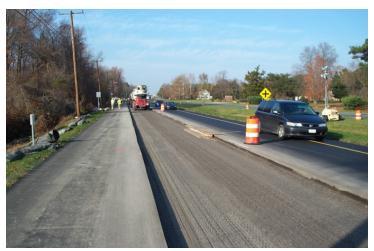 InFelton,Delaware,aportionofUS13wasbuiltusingathin,bondedinlayofanexistingACpavementinNovember2009. Thejobentailedputtinga6in.(150mm)thickbondedinlayaftermachininga6in.(150mm)sectionoftheouterlane.A small number of pre-overlay tasks were completed to patch up holes and fill fractures in the existing AC pavement. The overlay concrete had to reach compressive strength of 2,000 psi (13.8 MPa) in 12 hours to allow opening to traffic the following day. The panel measurements for the inlay were 6 by 6 foot (1.8 by 1.8 m). Figure 13 depicts the milled AC pavementpriortotheapplicationofanoverlay.thelocationoftheconcreteinlayandtheinlayjointsawingareshownin Figure14.
