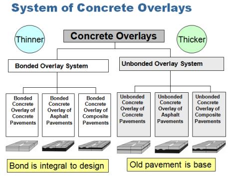 Figure 1 depicts the family of concrete overlays. Figure 2 provides a summary of the concrete overlays' application. As seen in Figure 2, existing pavements that are not substantially damaged can be effectively covered with thin concrete overlays.Unbondedconcreteoverlaysareincreasinglyacceptablewhenthequalityoftheoldpavementdeterioratessince theyrequirerelativelyminimalpre-overlayrehabilitation.Unbondedconcreteoverlaysarenormallythickerthanabout6 in.while bondedoverlays aretypically4to7in.(100to175mm)thick (150mm). However,asdiscussedinmoredetail below, good experience is being gained with the use of thinner, unbonded overlays that are 5 to 7 in. (125 to 175 mm) thick.
