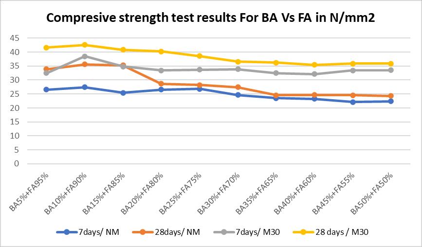 4. The various properties of hardened concrete that is compressive strength test, flexural strength test and split tensilestrengthtestdecreasesasweincreasethepercentage ofbottomash.ThecompressivestrengthForM30gradeat 10%BAreplacementfor7daysitisfoundmaximumvalueof