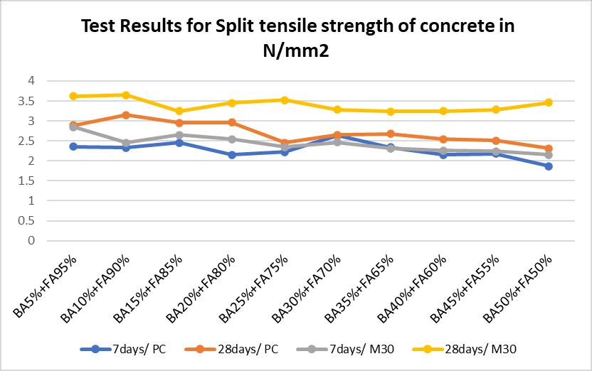 27.45N/mm2andfor28daysits35.65N/mm2.Similarly,for splittensilestrengthitsmaximumvalueis2.45N/mm2 for M30gradeat15%BAreplacementfor7daysalsoitisfound maximum value of 2.96 N/mm2 for 28 days. Similarly, FlexurestrengthforM30gradeat50%BAreplacementfor 7daysitisfoundmaximumvalueof2.85N/mm2 andfor28 daysits3.65N/mm2.Weseethatat10%replacementthe valuesismaximumvaluethatis3.65N/mm2