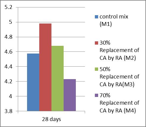 The compressive strength test showed that the compressivestrengthat3,7and28daysishighest for M2 (i.e. when 30% of coarse aggregate is replaced by recycled aggregate) followed by M1(control mix), M3(50% replacement of coarse aggregate by recycled aggregate) and M4(70% replacement of coarse aggregate by recycled aggregate)exceptforthe7daystrengthwherethe compressivestrengthofM3andM4isgreaterthan M1.