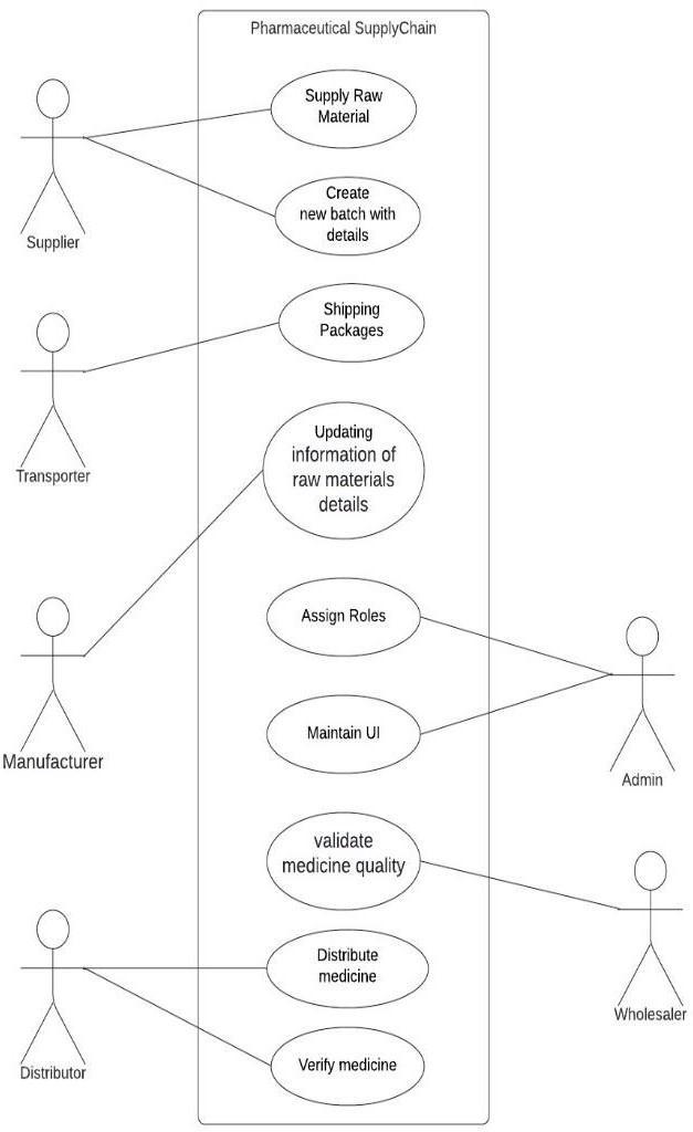 Supplier transfers the raw material to the Transporter. Supplier updates the product status and creates a Transaction in the Transaction Contract. Transporter transfers the raw material to the manufacturer. Manufacturer verifies the source of the rawmaterial and also updates the product status and creates a transaction in the transaction contract. The manufacturer registersa newmedicine.MedicineContractisdeployedfor the newly created medicine. Corresponding Transaction Contract is also deployed for the newly created medicineand the medicine is registered successfully. Manufacturer transfers the raw material to the Transporter and updates the product status and creates a transaction in the transaction Contract. Transporter transfers the raw material to the Wholesaler and the wholesaler verifies the source of theraw material. Wholesaler updates the product status andcreatesatransactionintheTransaction Contract.Thenthewholesaler transfers the raw material to the Transporter and updates the product status and creates a transaction in the Transaction Contract. Transporter transfers the rawmaterialtotheDistributor. Andthedistributorverifiesthesource of the raw material. Distributor then updates theproductstatusandcreatesa transaction in the Transaction Contract. The distributor transfers the raw material to the Transporter. and updates the product status and creates atransaction in the Transaction Contract. Distributor transfers the raw materialtothePharma.