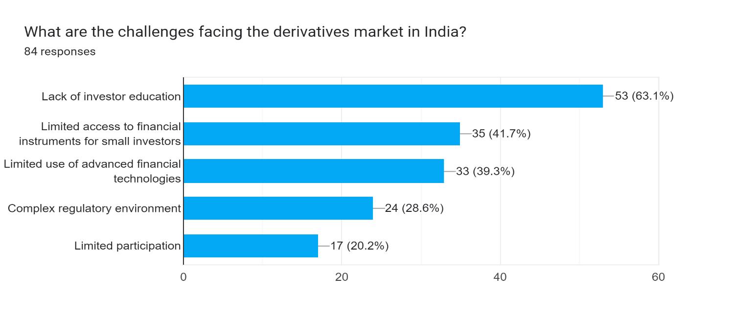 Chart 9 showsthatthemostcommonchallengefacedbyderivativemarketislackofinvestoreducationwhichis63.1%andit representsthatlimitedparticipationisthelowestchallengefaced.