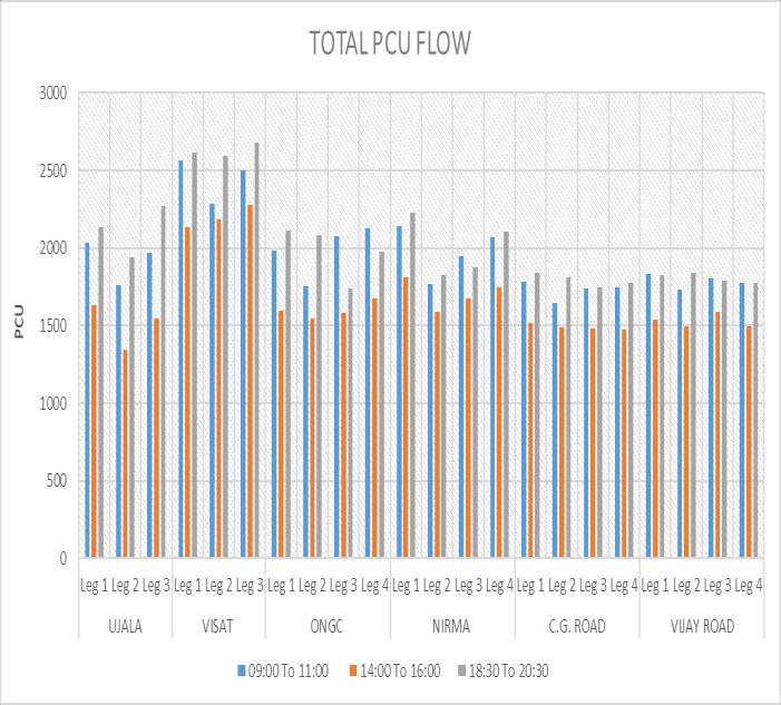 The total vehicle counts were taken at each intersection duringpeakhours(Morning&Evening)andoff-peakhours (Afternoon).Apeakinthemorningfollowedbyaleanflow until another peak in the middle of the afternoon, after whichtheremaybeanewpeakinthelateevening.Thepeak inthemorningisoftenmoresharpbyreachingthepeakover a short duration and immediately dropping to its lowest point.Theafternoonpeakontheotherhandischaracterized by a generally wider peak. The peak is reached and dispersed over a longer period than the morning peak. However,inurbansatellitetowns,themorningpeakmaybe too early and the evening peak may be too late in comparison to the principal towns without significant middaypeaks.Chart-1showstheTimevsno.ofvehicleflow for the same intersections and reflects the variant in the flow.