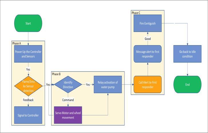 IOT can be implemented onto the robot to control it from another location in manual mode. More sensors can be mountedtoachieveabetterperformanceandwecanalso reducethereactiontimedetectingthefiresource.Withthe addition of a 360º camera we can achieve a great field of view.Thestoragecanbereplacedwithawaterpipelinefor extinguishinglargerfiresource.Colordetectionoffireisnot veryreliable.Henceathermalcameracanbeinstalledrather than the USB camera to achieve better detection of fire sourcebasedonintensity.