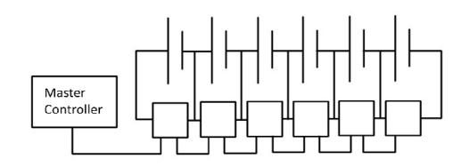 Inadistributedtopology,eachcellisequippedwithavoltage meter,adischargebalancer,andadigitalcommunications devicethatcanshutoffthechargerandreportonitsstate.