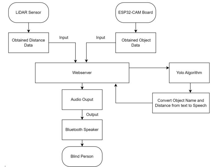 Inthisproject,YOLOv4analyzestheimagescapturedbythe ESP32CAMboard.Thealgorithmdetectstheobjectspresent intheimageandclassifiesthemintodifferentcategories.The informationisthenusedtoprovidetheuserwithaspeech output that includes the total number of objects detected, theirnames,andthedistanceofthenearestobject.