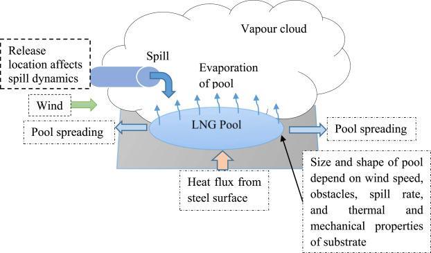 Unwanted releases of LNG can lead to hazards such as asphyxiation, cryogenic burns, and cryogenic damage to the ship, as well as dispersion, fires, and explosions. Accurate modeling of the gas cloud resulting from a spill onlandiscrucialtopredictthehazardsassociatedwithit. Factors such as wind direction and speed, atmospheric stability, temperature, humidity, and topography can also affect the behavior and dispersion of the gas cloud. Therefore,acomprehensiveunderstandingofthephysical andmeteorologicalconditionsatthespillsiteisnecessary foraccuratemodelingandriskassessment.