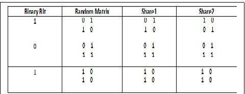 The encoding method suggested by Naor and Shamir [1] dividesabinarypictureintotwoshares,Share1andShare2. Fig.2 top two rows are selected to produce Share1 and Share2ifpixeliswhite.Similartothis,Share1andShare2 aregeneratedifapixelinthebottomtworowsofFig.2is dark.Sinceeachsharepixelpissplitintotwowhiteandtwo black pixels, neither share by itself can reveal whether a pixel p is white or black. Only when both files are superimposed will the secret picture be visible. Stacking sharesillustratesanORprocedure.ORisalossyrestoration procedure. We can get a lossless restore of the original picture if the XOR operation is used in place of the OR operation. However, XOR operation requires calculation. The OR procedure can only be simulated by the actual stackingprocess.