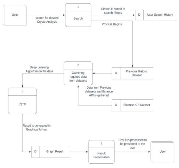 The model will provide its predictions to the user within secondsandalsoplotthispredictiononchartstoincreaseits interpretability.Theinputparametersaretheintegervalues of prices of cryptocurrency from past days to the current day,LSTMLayers,EpochandDropoutValue.Onthebasisof thatinformationourmodelwillpredicttheoutcome.Itwill do the operation on the values present in the dataset and predictthecurrentdayorthefuturedaypredictionwith7580%accuracy.