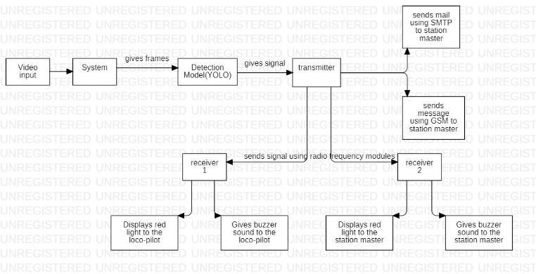 From the above we can say that there is still a chance to develop a better model to detect the elephants using machine learning and alert the loco pilot and station master using radio frequency technologies. Some of the major disadvantages of the previously developed systems aresome modelsrequiring continuous human monitoring, somemodelsusingoldGSMtechnologiestoalertlocopilot and station master. Our model overcomes all these major drawbacks of the previously developed systems. Our proposed system detects elephants on the track and notifies the engine driver and station master of their presence,reducingconflictsbetweenelephantsandtrains. The system's primary objective is to lessen the elephanttrain conflict the system consists of a camera which will monitor the railway tracks continuously and check every second for the presence of an elephant. The technology whichisusedtodetecttheelephantistheYOLO(YouOnly LookatOnce)objectdetectionmodel.Oncetheelephantis detected the system will send a response to Arduino nano which acts a microcontroller that transmits signals using radio frequency modules to the receiver which will be anothermicrocontroller(Arduinouno) presentat the loco pilotandthenearbystationmaster.