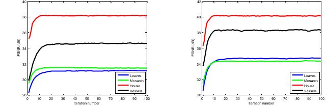 Here,empiricalevidenceisillustratedthegoodconvergence withaproposedalgorithm,theplotsofevolutionofPSNR versusiterationnumbersforfourtestimageswithvarious subrates (subrate=30% and subrate=40%). As from the observed growthofiterationnumber,allthePSNRcurves increasesmonolithically,stableandflatwhichexhibitsthe goodconvergenceproperty