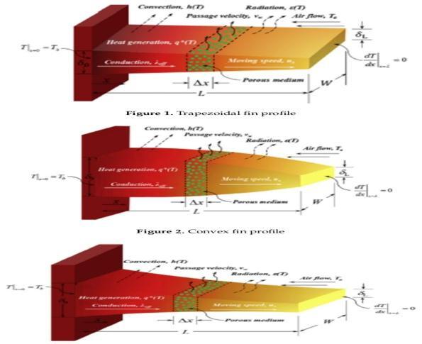 Intheparametricstudiescarriedout,theeffectofphysicalparameterssuchasconvective-conductive,convectiveradioactiveterm,internalheatgeneration,porosity, surfaceemissivity,powerindexofheattransfercoefficient,Pecletnumber andDarcynumberonthethermalbehavioroffinswereexaminedanddiscussed. Thecomparativeanalysiscarriedoutonthe effectofmaterialsonnon-dimensionaltemperaturedistributionrevealsthatcopperobtainsthehighesttemperaturewhilethe stainless steel gets the lowest. More-so, the fins with concave geometry gives the highest volume adjusted efficiency with increaseinPecletnumberwhilethatwithconvexprofilehastheleast.
