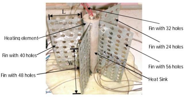 finarrayblocksofaluminumwith4mm,6mm&8mmperforationdiameterand6mmfinspacingwereexperimentallytested atvariousinputpowers40W,60W,80W,100W,120W.Anotherparameterbeingvariousinclinations(0-90)ofthefins.