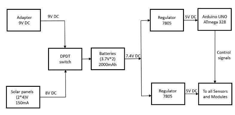 FromFig-1,wecanunderstandthatallsensorsandmodules will be under the control of the microcontroller. A 9V DC adapter can charge the batteries. Apart from this, the batteriescanevenbechargedbySolarchargingunit.From thebatteries,thesupplywillbegiventoArduinoUno,which, inturnfeedsallthesensorsandmodulesconnectedtoit.The regulatorsareusedtoregulatethevoltageto5V.