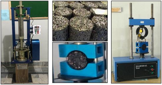 TheMarshallmethodofasphaltmixdesigniswidelypracticedinconstructionmaterialslaboratoriestoselectandproportion aggregateandasphaltmaterialsforpavementconstruction.Thefocusisondetermininganoptimumasphaltcontentthatwill provide maximum power to the mix with minimum deformation from axle loads. Marshall stability and flow test values, density, and air voids in the mix and test was carried out to evaluate the physical and chemical properties of the asphalt mixture,withoutadditivesorwithRAPandCNT.Marshallstabilityisthemaximumload(inkilograms)theasphaltsamplecan supportwithoutbreakingwhenloadedandMarshallflow isthedeformationread(inmillimeters)duringthemaximumload andfailure.Inthisstudy,mechanicalpropertiesofthesamplesarecomparedwitheachotherandfinally,amountofmaterials andtheresultingchangeswillbedetermined.Figure5showsmarshalltestaccordingtoASTMD6927.