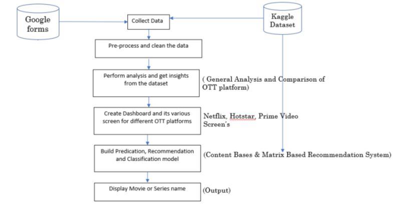 Data pre-processing will be carried out after data collection. Pre-processing would be followed by OTT platform-specificanalysisoneachscreeninordertoglean some actionable insights from the interactive charts. For each OTT platform, such as Netflix, Prime Video, and Hotstar, there would be a separate screen on the dashboard.