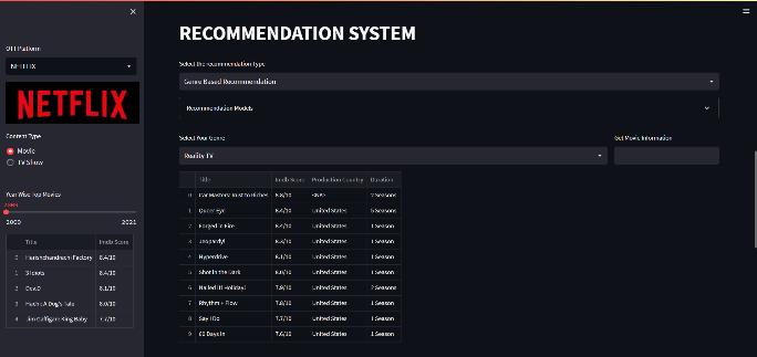 New possibilities for finding personalized information on the Internet are made possible by recommender systems. Italsoenablesuserstoaccessgoodsandservicesthatare not immediately available to users on the system, which helpstorelievetheissueofinformationoverload,whichis a fairly typical situation with information retrieval systems.Wehavedevelopedarecommendationalgorithm forNetlfix,PrimeVideo,andHotstarthatcansuggestfilms and television shows based on a user's affinity for a particulargenre.Themodelsalsomakerecommendations forfilmsthatarecomparabletothemoviedescriptionthat users enter in the input area. Additionally, our dashboard offers a thorough picture of how Covid19 contributed to the era of streaming platforms, as well as information on which OTT platform users prefer, how much time they spendthere,andtheirpreferredgenres.