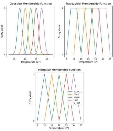 thecurrentapplication,thoselinguisticvariablesareusedin the IF-THEN rules evaluation [14]. For example, for the temperatureinputvariable,fivedifferentlinguisticvariables aredefined;VeryCold,Cold,Warm,HotandVeryHot.Based on the numerical value of the input temperature, each of those linguistic variables will be assigned a fuzzy value (rangingfrom0to1)[15].Forthispurpose,amembership function is used. There are various types of membership functions with different shapes such as triangular and trapezoidal membership functions [16]. The membership function converts the input value to a fuzzy value via a specificmathematicalequation,forexample,theequationof thetriangularmembershipfunctionisdepictedin(1)and (2).Threevalues representingtheupper,lowerandmedium values of each linguistic variable are also taken intoconsideration [17, 18]. Table 1 shows the linguistic variablesofthetemperatureinputvariableaswellasthea, b and c values required by the triangular membership functionequationforcomputingthefuzzyvalue.