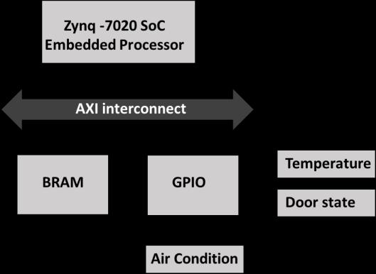 The hardware architecture includes two ports, a memory blockRAMwith64KBsizeandBRAMController.BRAMdata is accessed within single cycle latency. Advanced Xilinx Interconnects (AXI) is introduced to the system hardware to act as bus system. The general purpose input/output (GPIO) unitprovidesahardwareinterfacebetweentheprocessor system AXI and the sensors (temperature and door state sensors)[35,36].