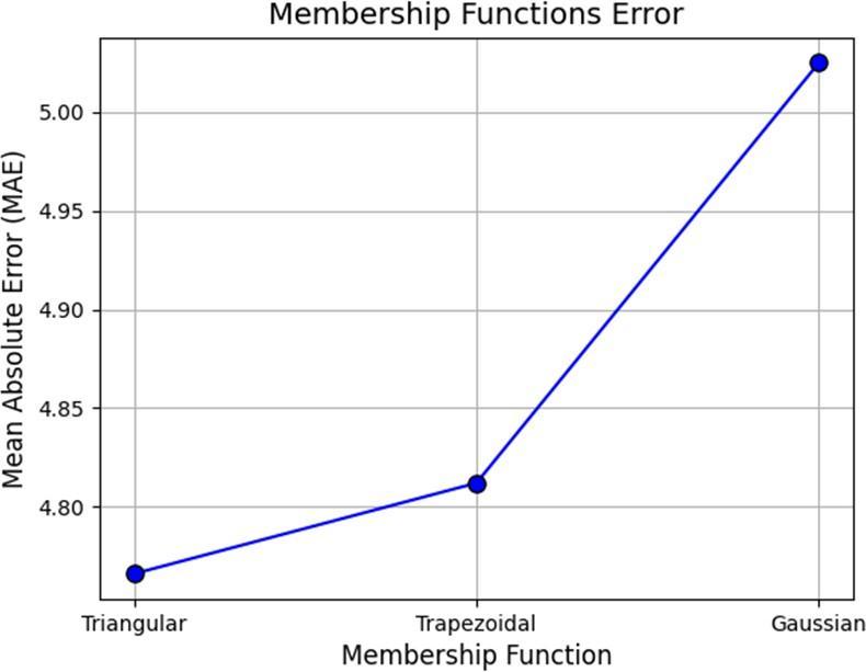 The three built fuzzy logic systems were evaluated by predicting the output variable (run time) using the temperature anddoorstateasinput variables.Theoutputof eachsystemwascomparedtotheoptimumruntimeandthe errorofpredictionwasmeasured.Theerrorplotofthethree systemsisdepictedinFigure5.Ascanbeseen,thetriangular membership function showed the lowest MAE value (4.766), which indicates a lower prediction error compared to the other two membership functions. The trapezoidal and Gaussian membership functions had higher MAE values (4.812 and 5.025, respectively) which reflects lower prediction accuracy compared to the triangular membership function.