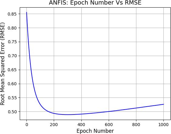 TotrainandvalidatetheANFISmodel,theoveralldatawas dividedintotwodifferentsets,namely,thetrainingsetwhich wasusedfortrainingandthemodelandthetestsetwhich wasusedforevaluationofthemodelperformance[31].The training process of the ANFIS involves a running of the networkforseveralepochs(cycles),duringeachepoch,the error of the network prediction is computed via a cost function and the weights of the network are updated to minimize the error [32]. The root means squared error (RMSE)wasusedasthecostfunction[33].Todeterminethe optimumnumberofepochs,thenetworkswereallowedto runfor1000epochsandtheerrorwascomputedaftereach epoch. Thenumberof epochsthat correspondstothelowest error is considered to be the optimum epoch number for trainingthenetwork.
