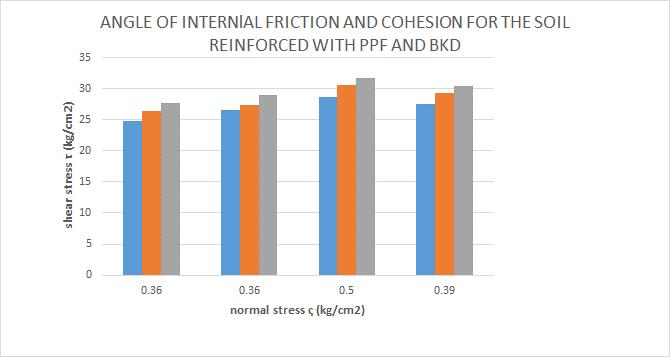 The direct shear strength parameters of the soil reinforced with waste fibres of PP and BKD employedfortheenhancementoftheengineering propertiesofthesoilwith20mmlengthandweight of polypropylene by weight of dry soil sample, is found as increase in the angle of internal friction (Φ)andincreaseincohesion(c).