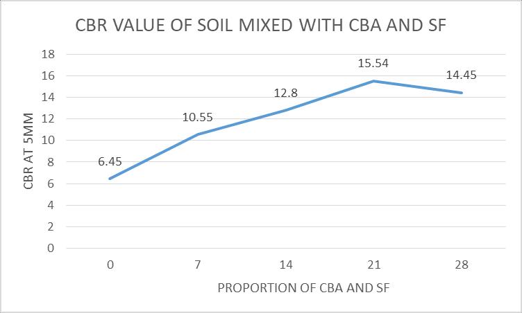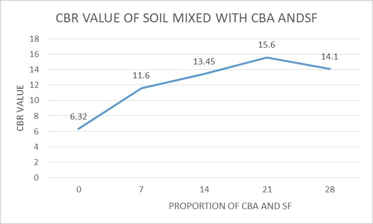 establish the effect of CBA on the soil California bearing ratio. The maximum amount of CBA that wouldallowforanincreaseforCBRvalueis6%and also by adding the percentage of Silica Fume the valuesofCBRagainrisesat20%ofsilicafume.