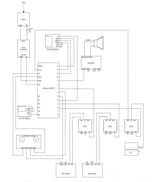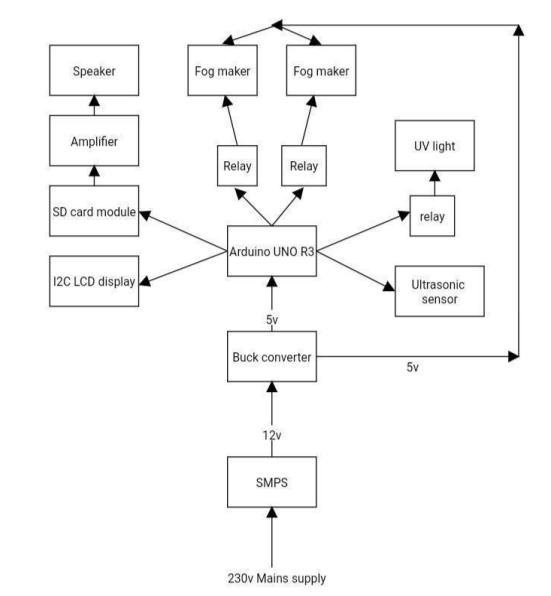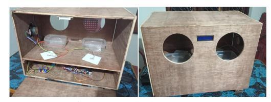 The shape of the box is rectangular and it is made of plywood.Theplywoodiscutintoseveralpiecesandjoined togetherin theshapeofa box.Twoholesaremadeinthe front panel to insert our hands, and also a small rectangularshapedcutismadetoplacetheLCDdisplay.A speaker,dc switch and an smps adaptor plug is also fixed at the right side of the box. The box is divided into two chambers.Thecircuitpartisplacedinthelowerchamber and the upper chamber comprises two containers that containsanitizer.Thefogmakerfloatsonthesanitizerand it functions at its time. The division of the chamber helps to prevent falling the sanitizer droplets on the circuit and avoidtheshortcircuit.Thebacksideisopenable,thisway isusedtostockthesanitizerintothecontainer.Ahandleis providedonthebackpaneltoopen.