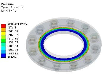 Themaximumcontactpressureintheabsenceofgasketis found to be 310.61Mpa as shown in figure 3.20 and in presenceofgasketwillbe185.54Mpaasshowninfigure3.21