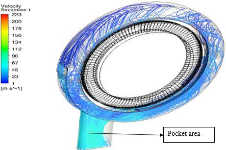 Before emerging from the bleed pocket, the steam rotates 360 degrees. Blue color indicates the flow. Steam moves throughthebleedpocketata55m/sspeed