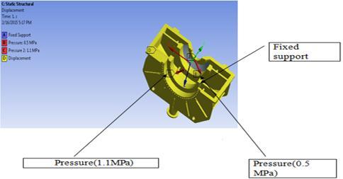 Thefigureillustratestheuseofboundaryconditionsforthe staticstructuralanalysisofcasing.AtpointA,fixedsupportis provided. For phasic analysis, the pressure of 0.5 MPa is indicated at point B in the above diagram. At point C, a pressureof1.1MPaisstated.Thedisplacementisrecorded asapointintheYdirectionsincesteamisbelievedtotravel inthisdirection