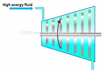 When a high energy fluid (one with high pressure and temperature)travelsoveraseriesofrotorblades,theblades absorbthe fluidsenergyand begin to rotate, ittransforms thermalenergyinthefluidtomechanicalenergy.
