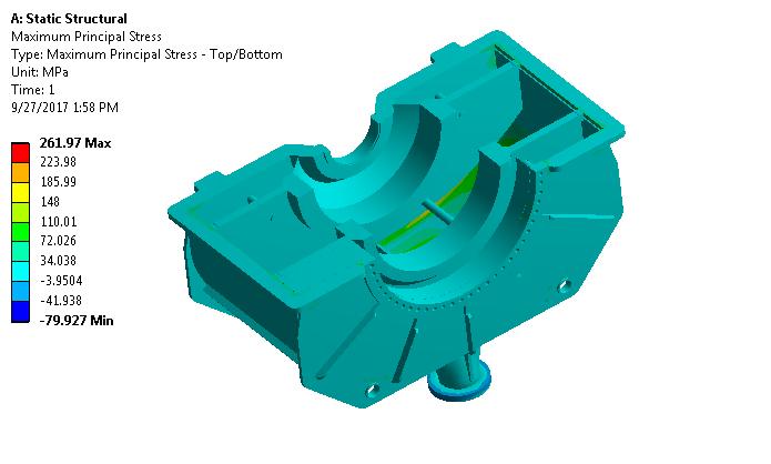 Thisfiguredisplaysthecasing'smaximumprincipalstress. The261.97Mpamaximumprincipalstressisdepictedinred.