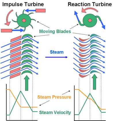 The rotor blades in the reaction turbine are placed in convergentnozzleconfigurations.Thistypeofturbinemakes useofthereactionforceproducedasthesteamaccelerates throughthenozzlesformedbytherotor.Steamisdirected ontotherotorbythefixedvanesofthestator.Itleavesthe statorasajetthatfillstheentirecircumferenceoftherotor. Whencomparedtotheblades'speed,thesteamthenreverses the course and picks up speed. With steam accelerating throughthestatoranddeceleratingthroughtherotor,there isapressuredropacrossboththestatorandtherotor.There isnonetchangeinsteamvelocityacrossthestage,butthere isareductioninpressureandtemperature,representingthe effortdoneinmovingtherotor.