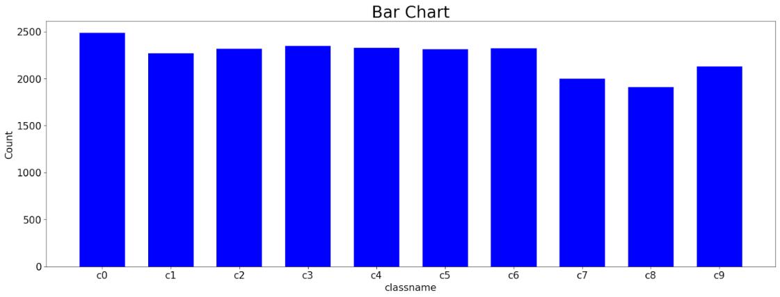 ThedatasethascollectedthetrainingimagesfromtheState Farm. It consists of a variety of images distributed in 10 categories. The distribution is arranged in a way so that there will be very less possibility of duplicate images. All theimagesareofadriversittinginsidethecar.Therearea total of 22,424 images classified into 10 categories. The countofimagesineverycategoryisshowninfigure[3].The categoriesare: