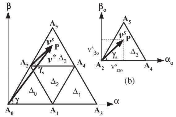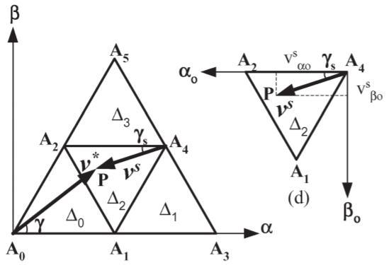 Forexample;InFig.3(a),triangle3canbeassumedsimilar to sector 1 of a two-level inverter if A2 is taken as zero vectorofthevirtualtwo-levelsectorasshowninFig.3(b). Vector A2P defines the small vector vs(vs αo, vs βo). Ontimesta(tA4),tb(tA5),andto(tA2)arecalculatedbyusing (5)–(7), where the multiplication operations are required onlyfor(5)and(6).Atriangleoftype2issimilartoasector 4 of a virtual two-level inverter. For example; In Fig. 3(c), triangle2canbeconsideredsimilartosector4ofatwo-level inverterifA4isassumedtobezerovector[seeFig.4(d)].In thisexample,A4Prepresentssmallvectorvs(vsαo,vsβo). On-timesta(tA2),tb(tA1),andto(tA4)arecalculatedby using(5)–(7).
