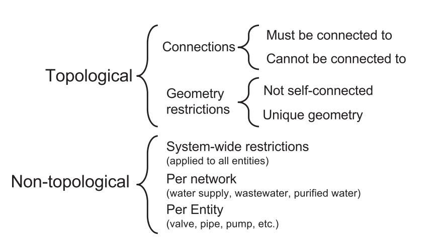According to Pablo Fernández Moniz ET. Al some of the simpletopologicalvalidationforanetworkdataincludes1) 2 lines must not overlap 2) pipe ends must always be connected 3) no two polygons must overlap etc. Once the datadigitizationiscomplete,thevalidationprocessindone byrunningthroughtherestrictionwhicharepredefinedin thedatamodel.TherestrictionscanbeTopologicalornontopological. The details of restrictions for a pipe network dataisasshowninFig6[vijaylkanti,ETal.2004]