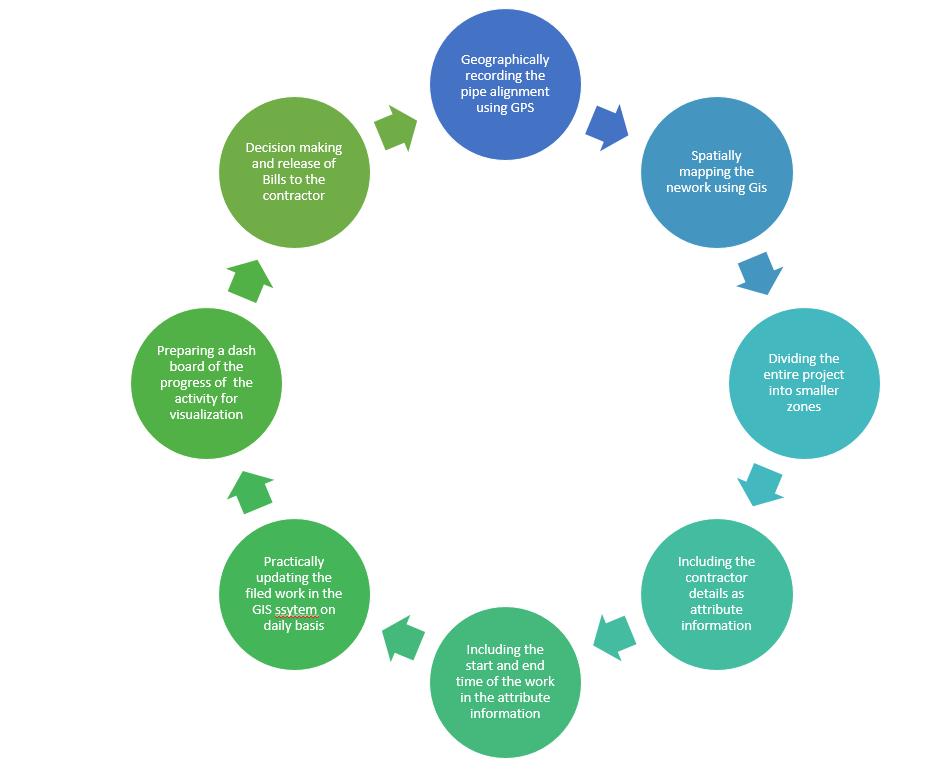 Key Words - GIS, project, construction management, flood analysis, water works, spatial data, and non-spatial data, and spatial analysis, hydraulic simulation. Pipe network optimization